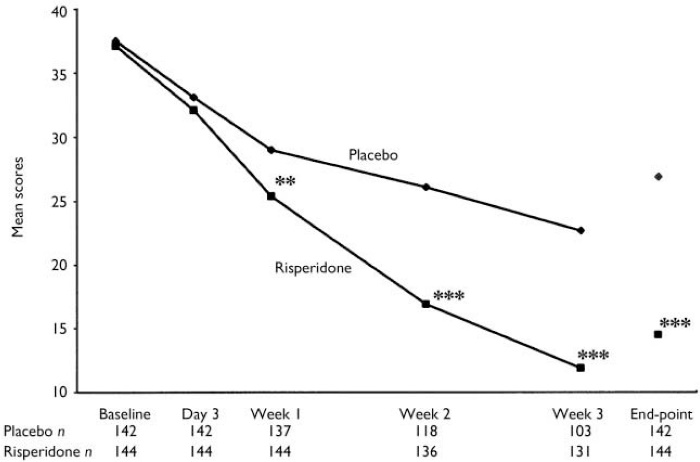 A melhora clínica não é imediata, mas sim progressiva e cumulativa ao longo do tempo. É esperado que ocorra uma melhora parcial após 1 semana de uso no tratamento do transtorno bipolar7 (como mostra o gráfico abaixo) e em quadros psicóticos, mas o efeito máximo da medicação pode demorar 3 semanas ou mais para ser atingido.